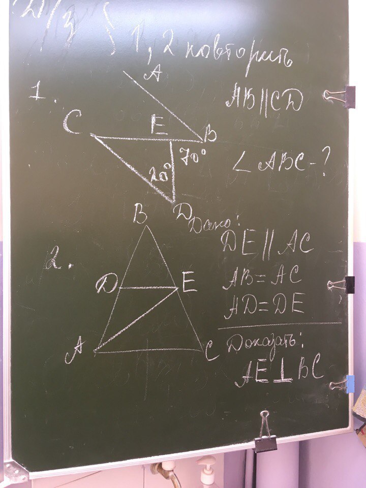 Сумма смежных углов 180 градусов. Сумма углов в треугольника 180 градусов.180-70=110 угол дес. 180-(20+110)=70 угол авс