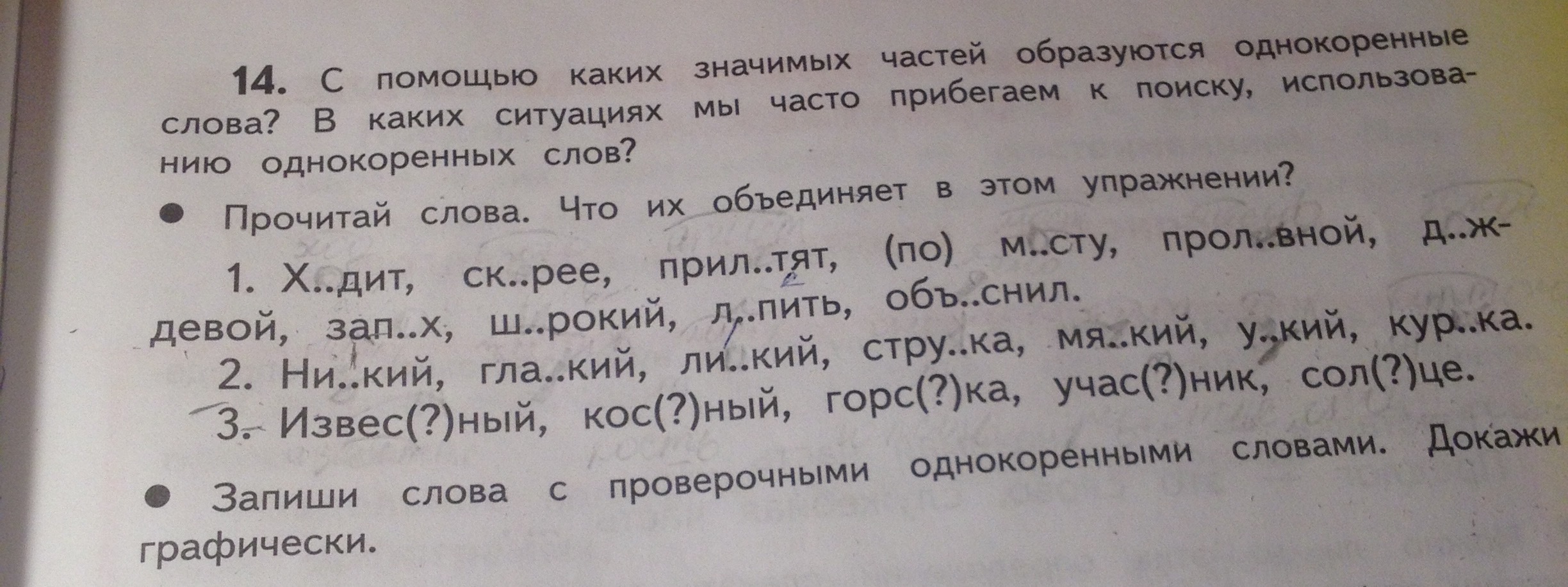 1. Ходит (ход), скорее ( скоро) , прилетят ( перелёт) , ( по) мосту ( мост) , проливной ( ливень) , дождевой ( дождь) , запах ( пахнет) , широкий (ши'роко), лепить ( лепка) , объяснил ( ясно) .
