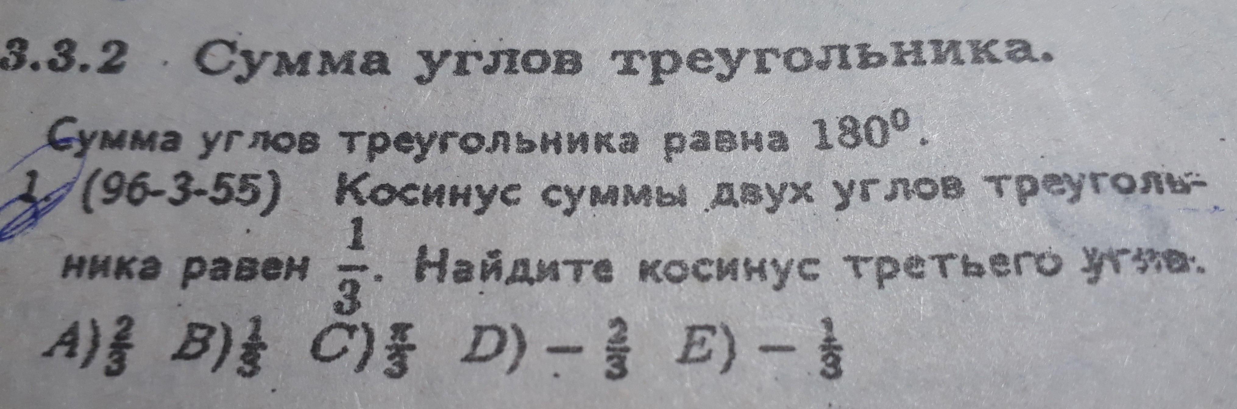 пусть сумма 2 углов в градусах равна х, тогда косинус третьего угла:
