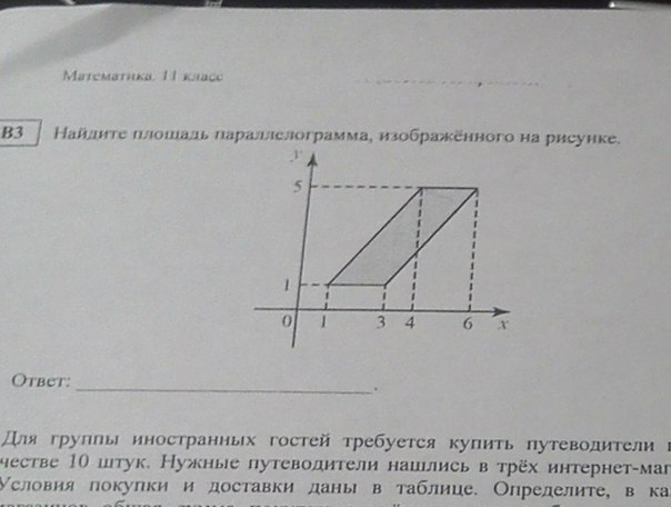 дорисуем, чтобы получился большой прямоугольник из параллелограмма и двух треугольников, площадь прямоугольника=25, а каждого треугольника=6=> площадь параллелограмма=25-6-6=13