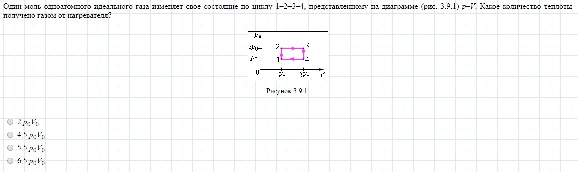 Q=A+ΔU Работа = площади фигуры ограниченной графиком А=(P2-Po)(V2-Vo)=PoVo ΔU=3kRΔT/2 ΔT=(4To-To)=3To ΔU=9kRTo/2=9kRPoVo/2kR=9PoVo/2 Q=9PoVo/2+PoVo=5.5PoVo это ответ