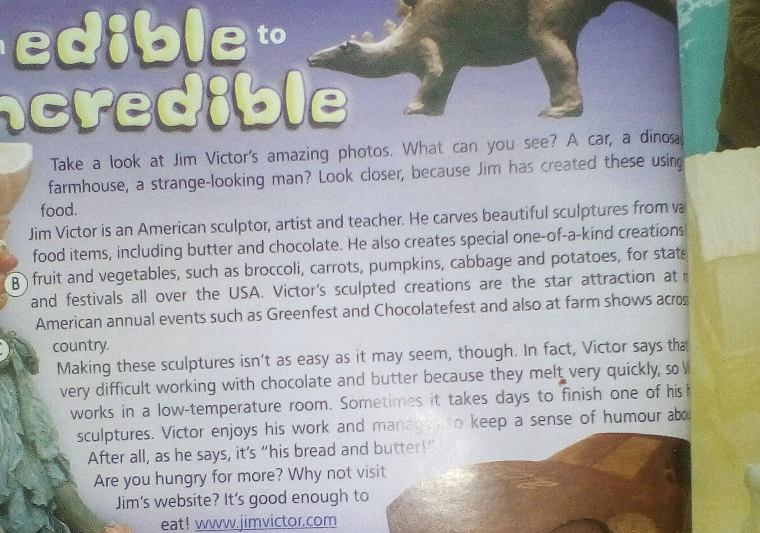 Джим Виктор - американский скульптор, художник и учитель. Он вырезает скульптуры из различной еды, включая масло и шоколад. Также он создает единственные в своем роде творения из фруктов и овощей, таких как брокколи, морковь, тыква, капуста и картофель для ярмарок и фестивалей по всей Америке. Скульптурные творения Виктора привлекают внимание на многих ежегодных встречах в Америке, таких как Зеленый и Шоколадный фестивали, а также на фермерских фестивалях по всей стране.