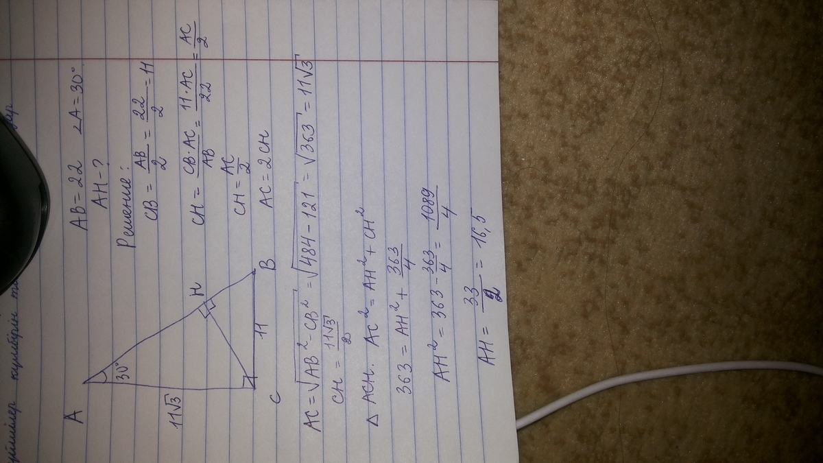 Значит AH=AB-HB=22-5,5=16,5