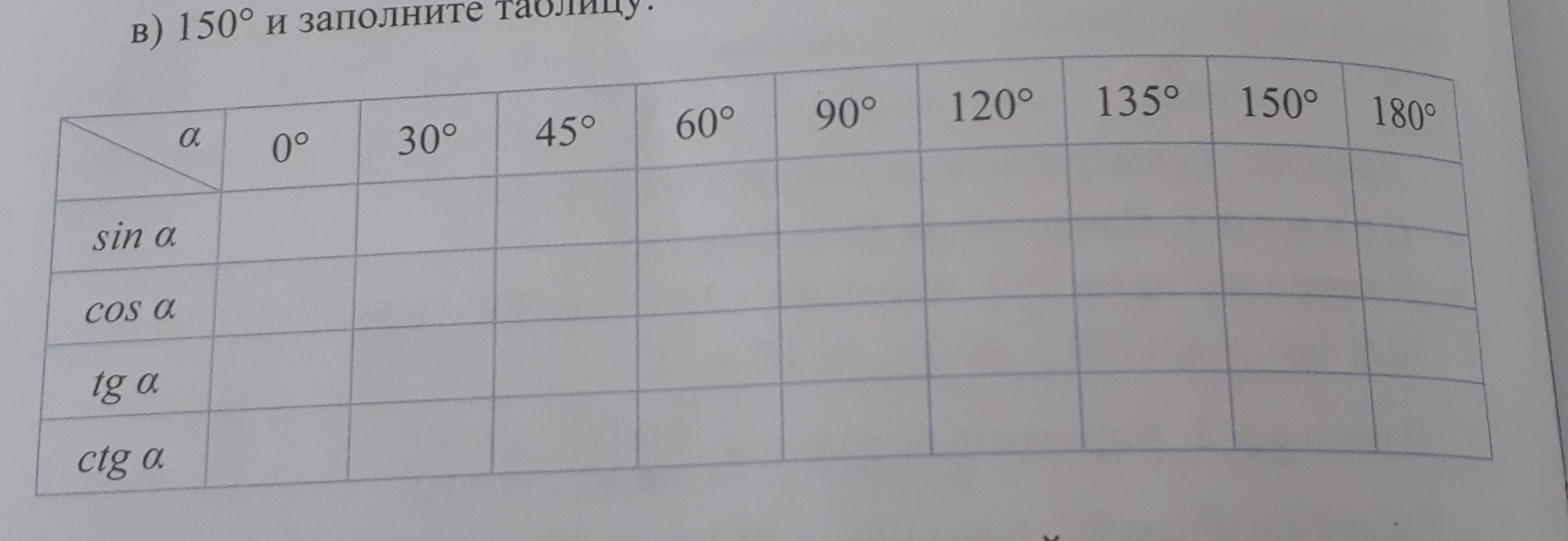 найдите синус, косинус, тангенс и котангенс углов: A120; Б 135; В 150 и заполните таблицу.