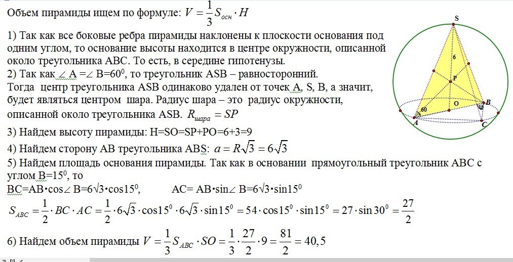 В основе пирамиды лежит прямоугольный треугольник с углом 15 град. Все боковые ребра пирамиды наклонены к площади основания под углом 60 град. Радиус шара, описанного вокруг пирамиды равен 6 см. Вычислить объем пирамиды