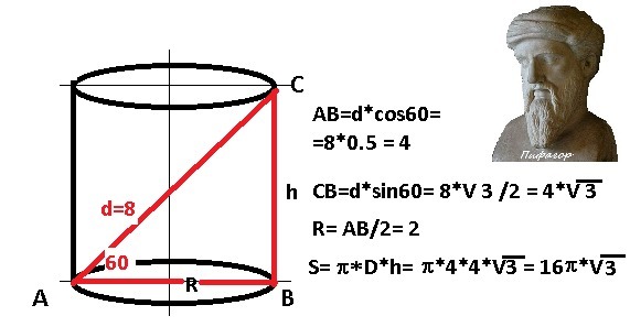 Диагональ осевого сечения цилиндра равна 8 см и составляет с образующей угол 60 . Найдите А)высоту цилиндра ;Б) радиус ; В)Площадь полной поверхности