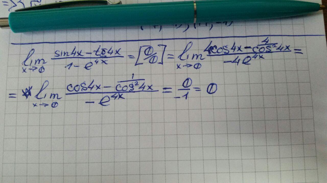 помогите вычислить предел lim x-0 sin4x-tg4x/1-e^4x