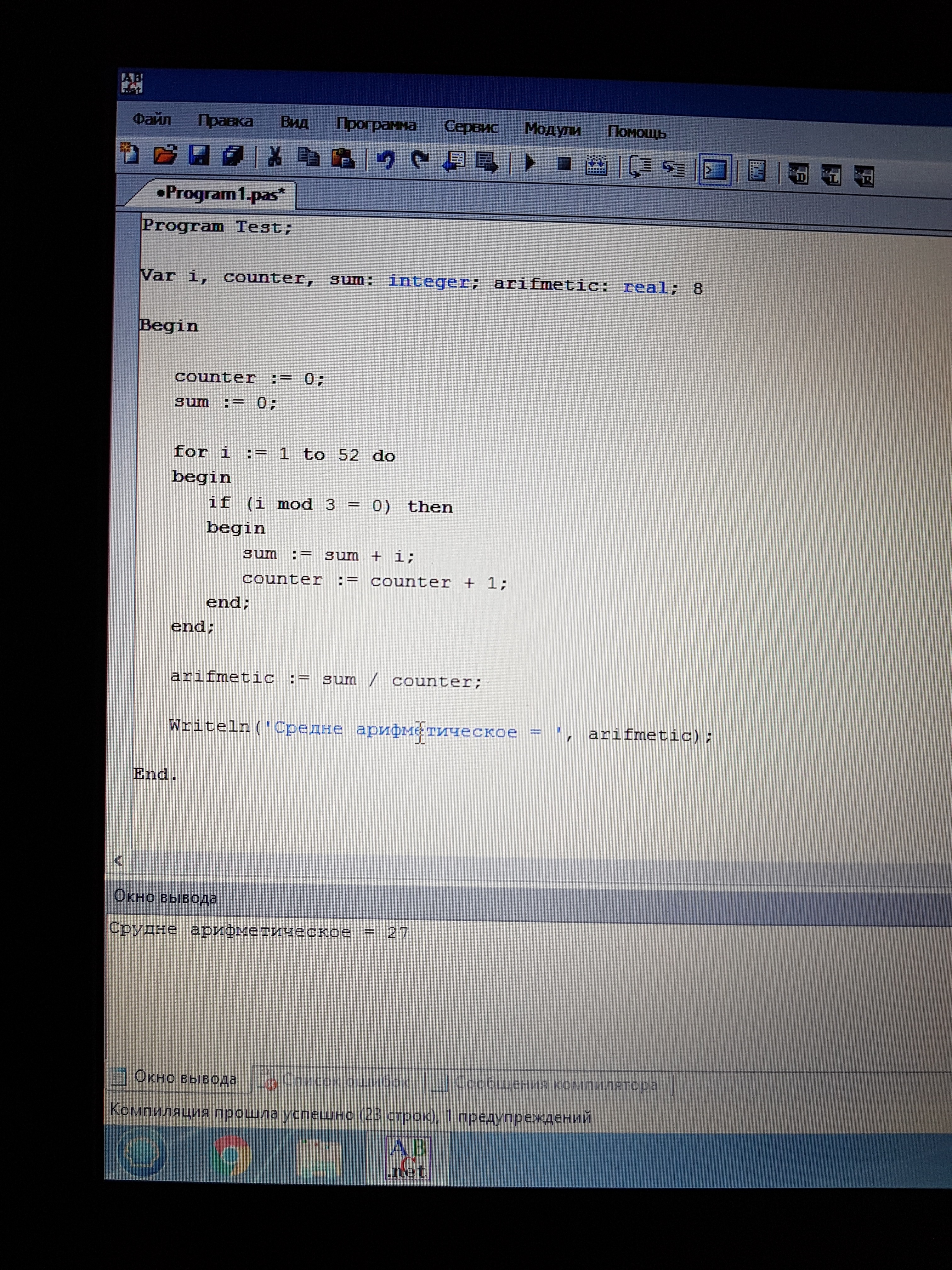 Помогите!! Написать программу, которая подсчитывает среднее арифметическое всех чисел кратных 3 из диапазона от 1 до 52?