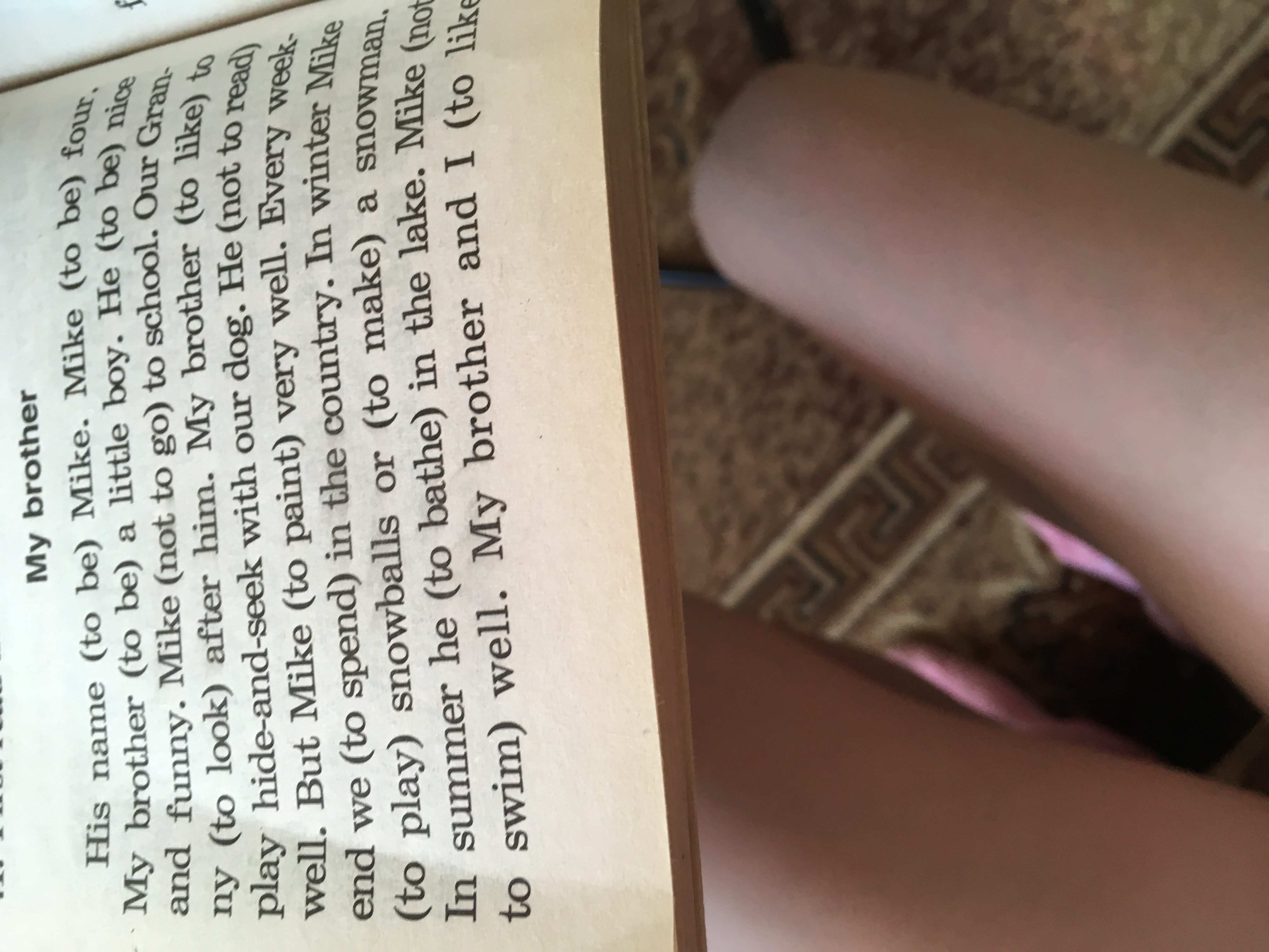 His name IS Mike. Mike IS four.My brother IS a little boy. He IS nice and funny. Mike DOESN'T GO to school. Our Granny LOOKS after him. My brother LIKES to play hide-and-seek with our dog. He DOESN'T READ well. But Mike PAINTS very well. Every weekend we SPEND in the country. In winter Mike PLAYS snowballs or MAKES a snowman. In summer he BATHES in the lake. Mike DOESN'T SWIM well. My brother and I LIKE to build sand-castle on the beach. I LIKE my brother.