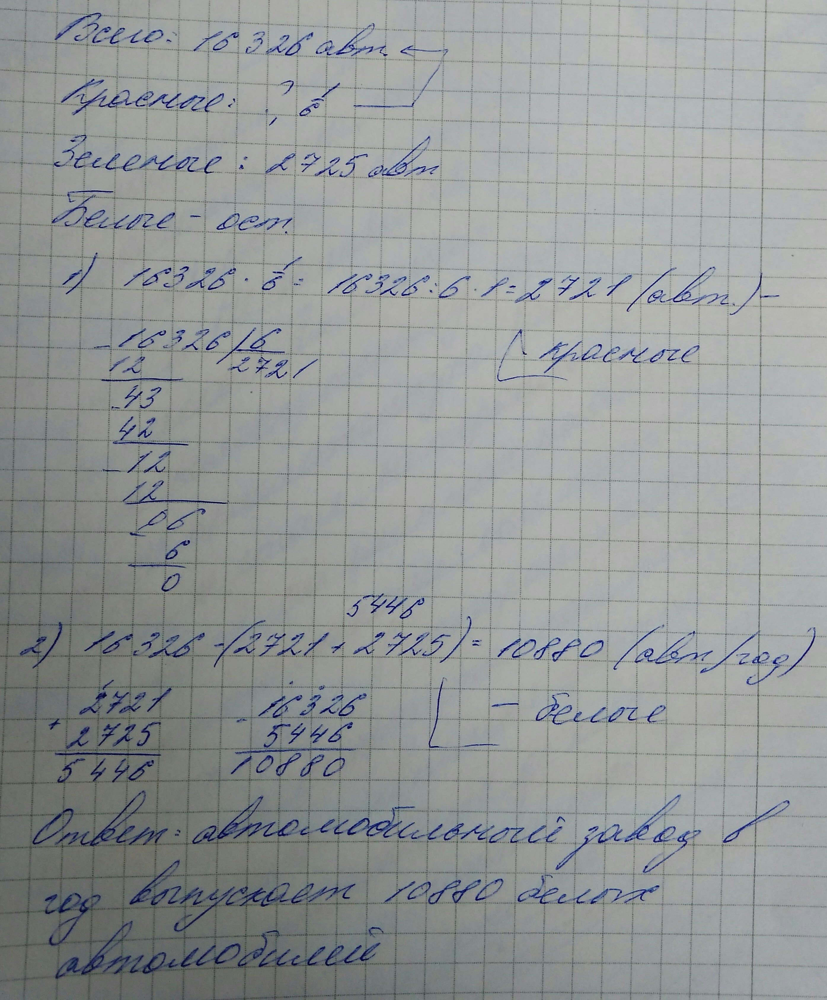 Автомобильный завод выпускает 16.326 автомобилей в год. Шестая часть из них красные, 2725-зелёные, а остольные белые.Сколько белых автомобилей выпускает завот в год.