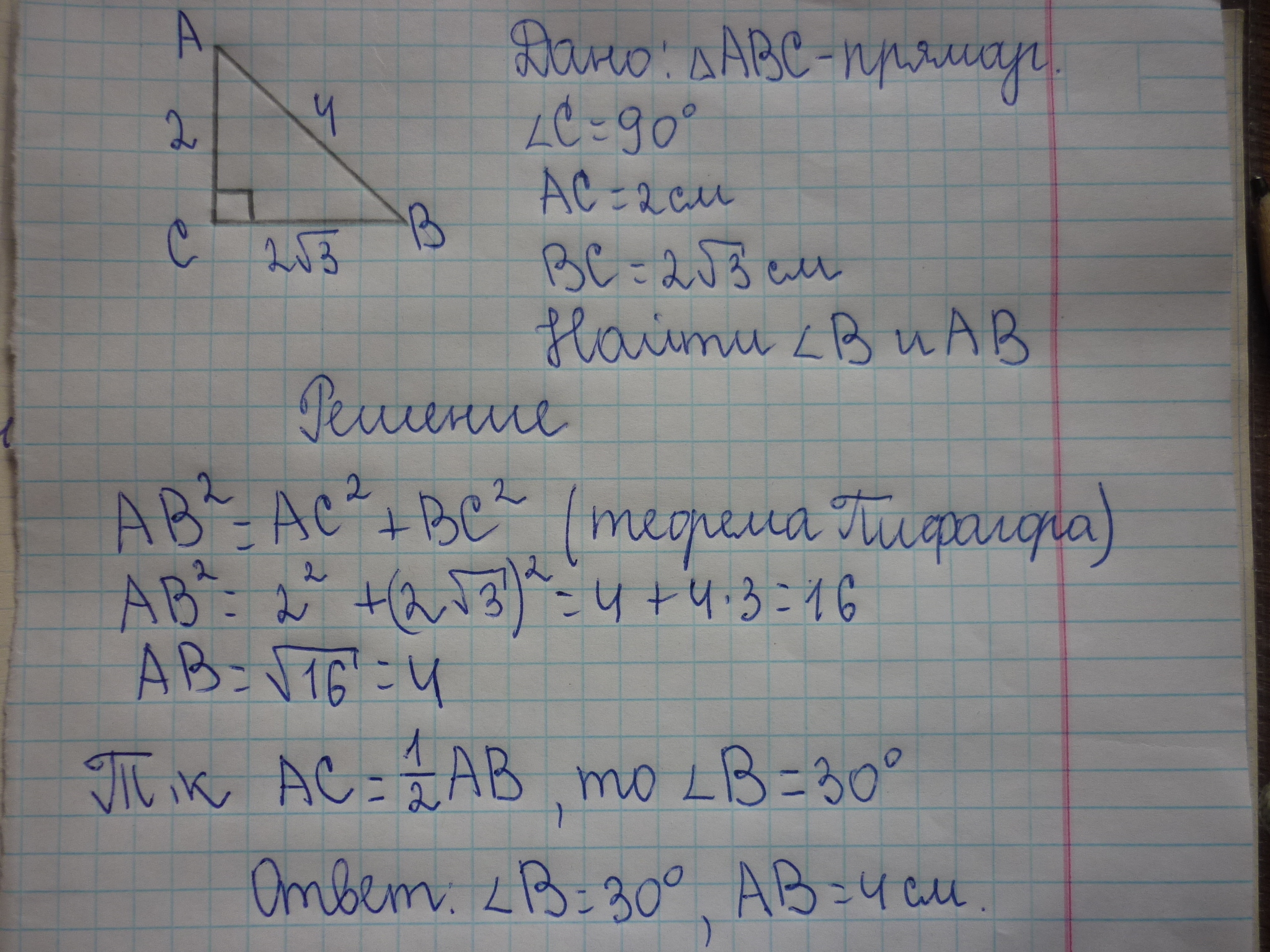 В прямоугольном треугольнике АВС (угол С 90 градусов) АС=2см, ВС=2корня из 3. Найдите угол В и гипотенузу АС.