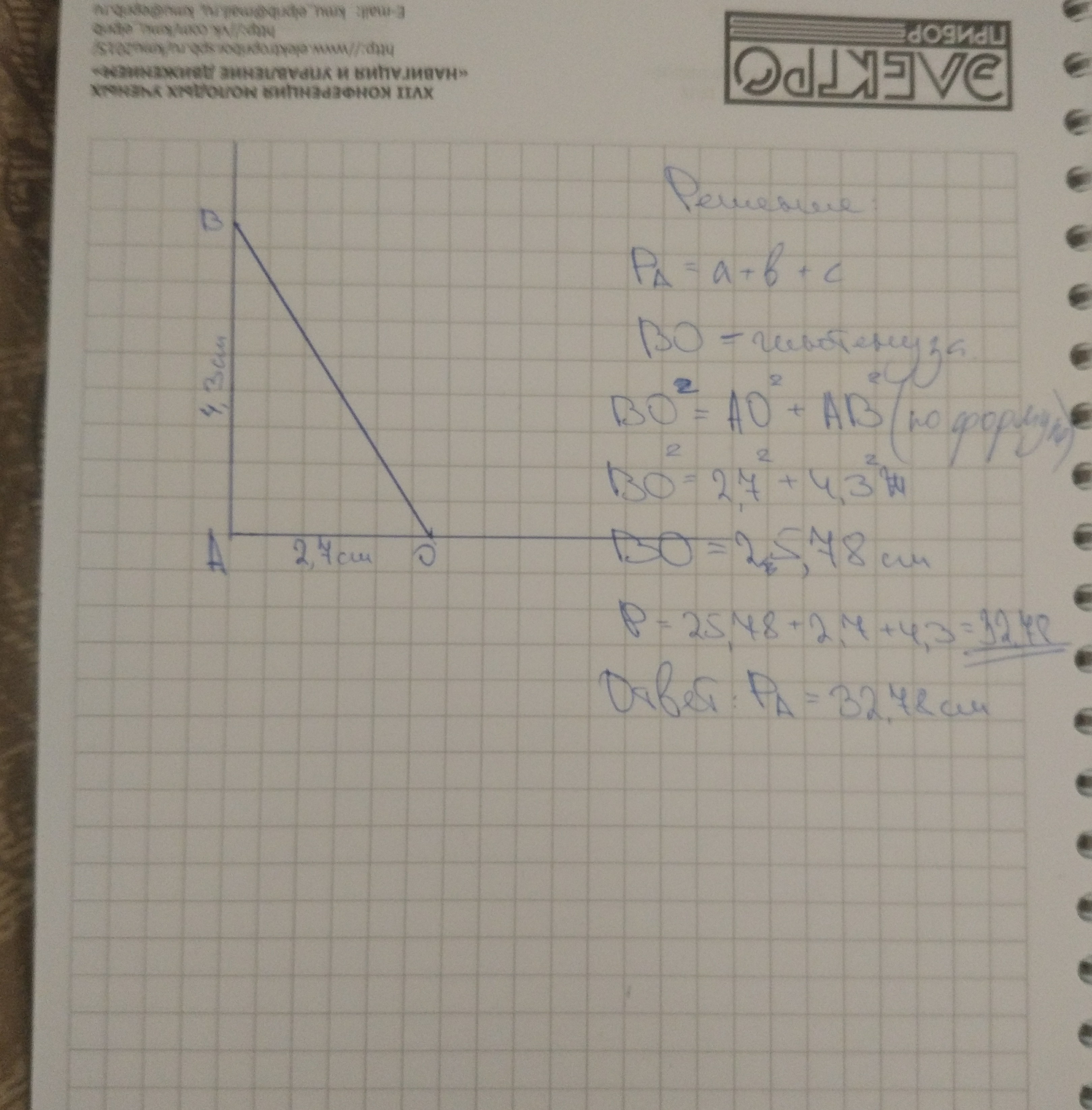Начертить прямой угол. Обозначит его вершину буквой А. На одной стороне угла отложить отрезок ОА=27 мм, на другой отрезок АВ=43 мм. Построить треугольник ОАВ и вычислить его периметр.