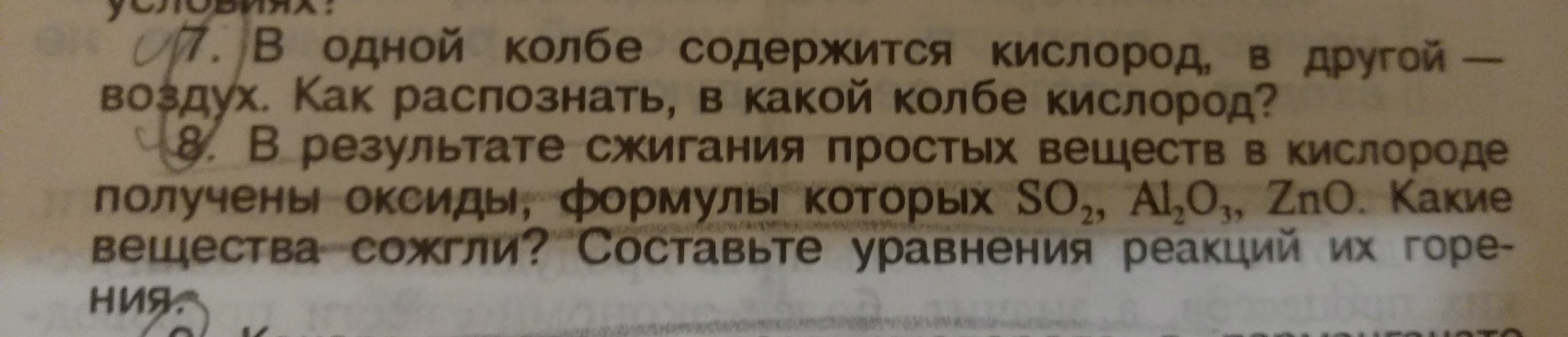7. Положить туда тлеющую лучину.Если вспыхнет,значит в колбе находится кислород. Или исходя из молекулярных масс. Молекулярная масса воздуха меньше (29) чем кислорода (32). Колба с воздухом легче.