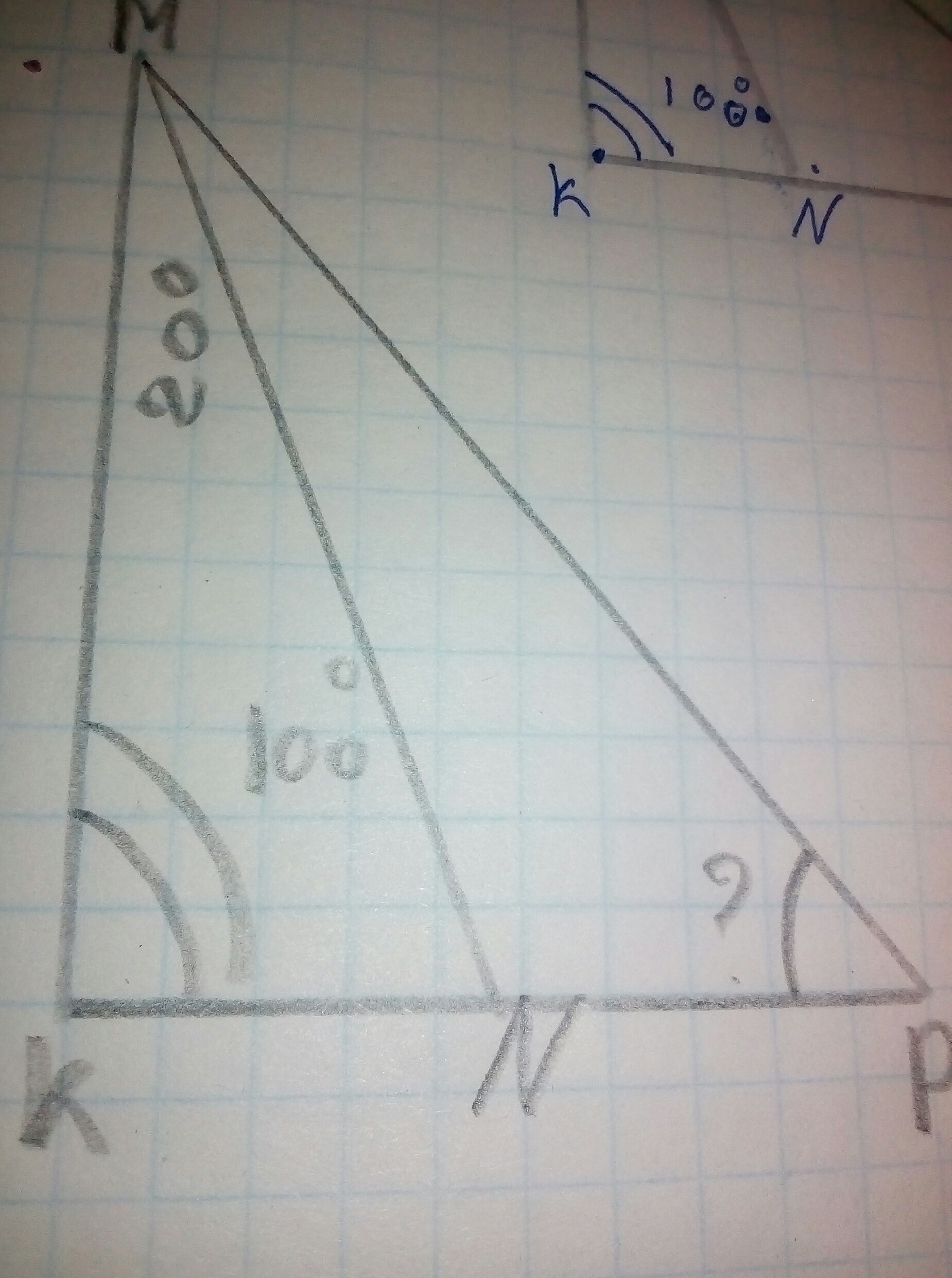 Итак. От угла М проведена биссектриса, делящая угол на две равные части, соответственно угол М равен 20+20=40°. А так как сумма углов треугольника равна 180°, то угол Р равен 180°-(40°+100°)=180°-140°=40°
