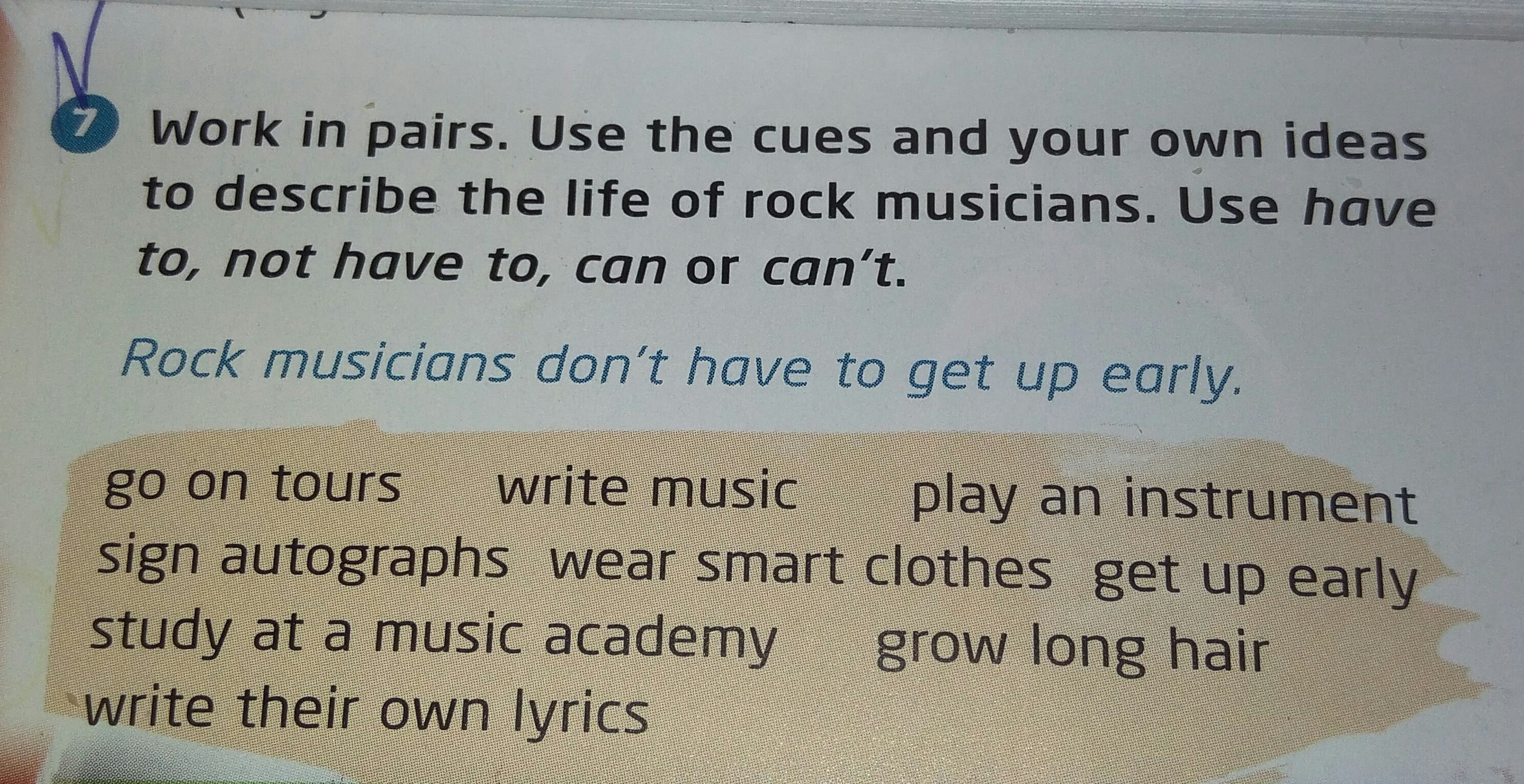 rock musicians have to go on tours, can write music, have to play an instrument, have to sign autographs, don't have to wear smart clothes, don't have to get up early, can study at a music academy, can grow long hair, can write their own lyrics