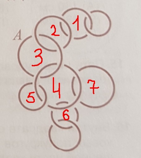 Несколько из нарисованных колец образуют цепочку,в которую входит кольцо А.Сколько колец в этой цепочке?
