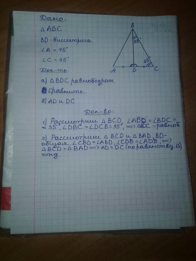 угол B=180-35-75=70градусов 1) рассмотрим треугольник BCD угол ABD=уголBDC=35 градусов угол DBC=угол DCB=35 градусов Значит треугольник BCD равннобедренный по теореме о равнобедренном треугольнике где углы при основание равны. 1 рассмотрим треугольник BCD и треугольник BAD BD общая сторона угол CBD = угол ABD уголCDB=ADB Значит BCD=треугольнику BAD по второму признаку равенства треугольников Из равенства следует что AD=DC