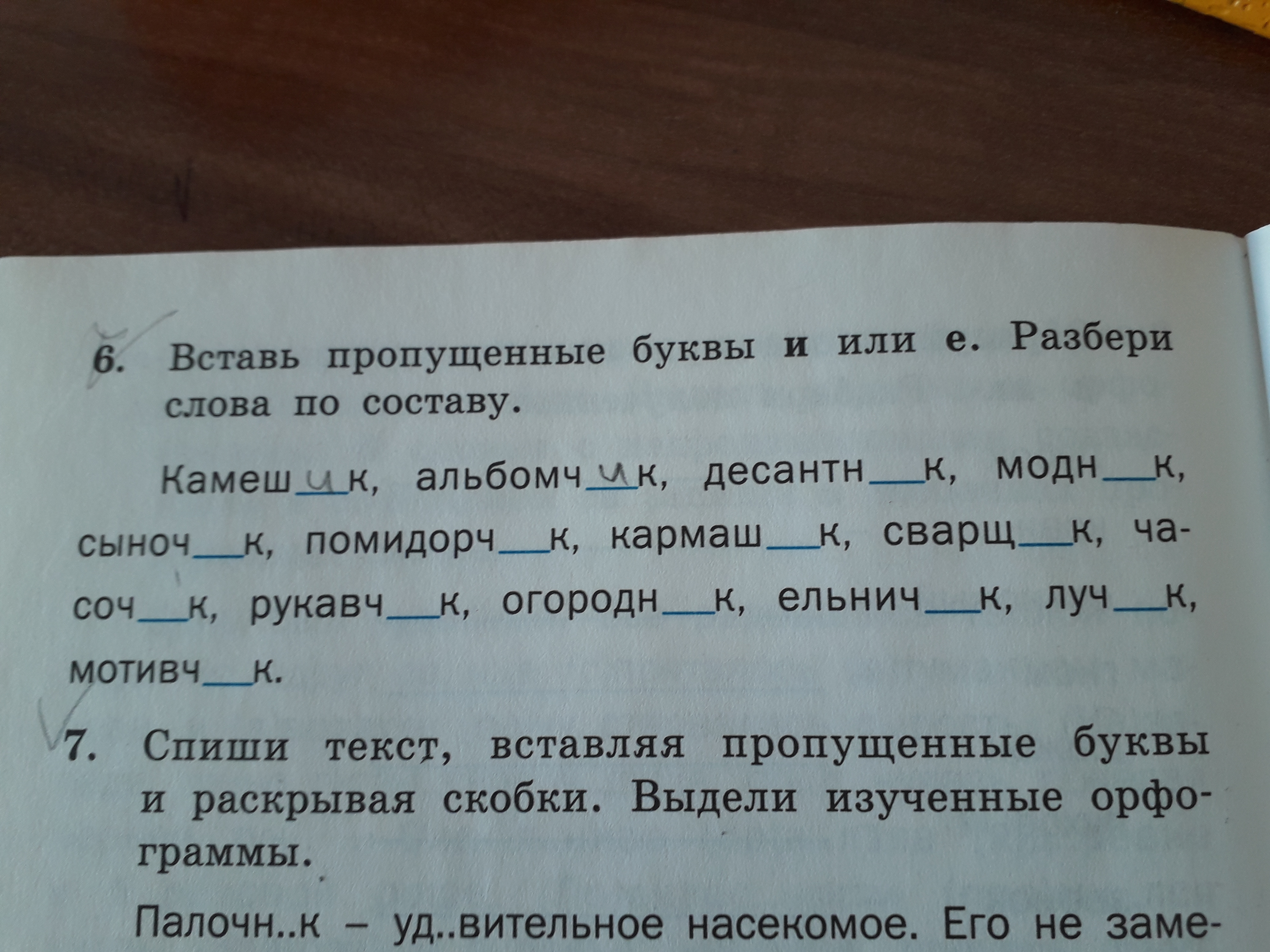 Вставь пропущенные буквы и или е. Разбери слова по составу