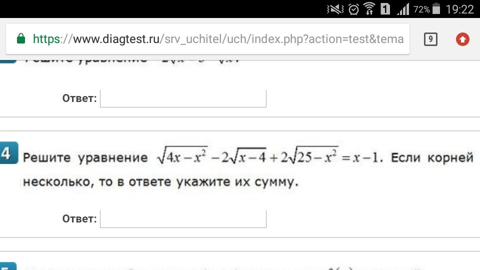 √(4x-x²)-2*√(x-4)+2*√(25-x²)=x-1 √(4*4-4²)-2*√(4-4)+2*√(25-4²)=4-1 √(16-16)-2*√(4-4)+2*√(25-4²)=3 0-2*0+2*√(25-4²)=3 2*√(25-16)=3 2*√(9))=3 2*3=3 6≠3.