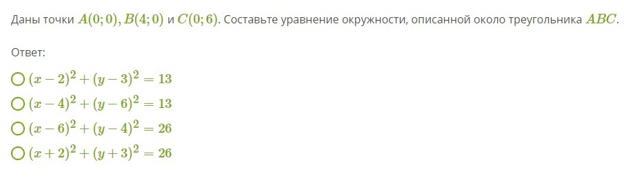 О = 1/2(В+С) = 1/2*(4+0;0+6) = 1/2*(4;6) = (2;3)