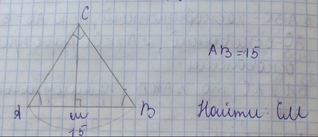 Т.к. треугольник ABC- прямоугольный и равнобедренный =>угол ABC=(180-90):2=45 градусов. А т.к. в равнобедренном треугольнике высота является биссектрисой=>угол ACM=90:2=45 градусов. Следовательно, треугольник AMC-равнобедренный (по двум равным углам треугольника). Значит AM=MC=7.5см.