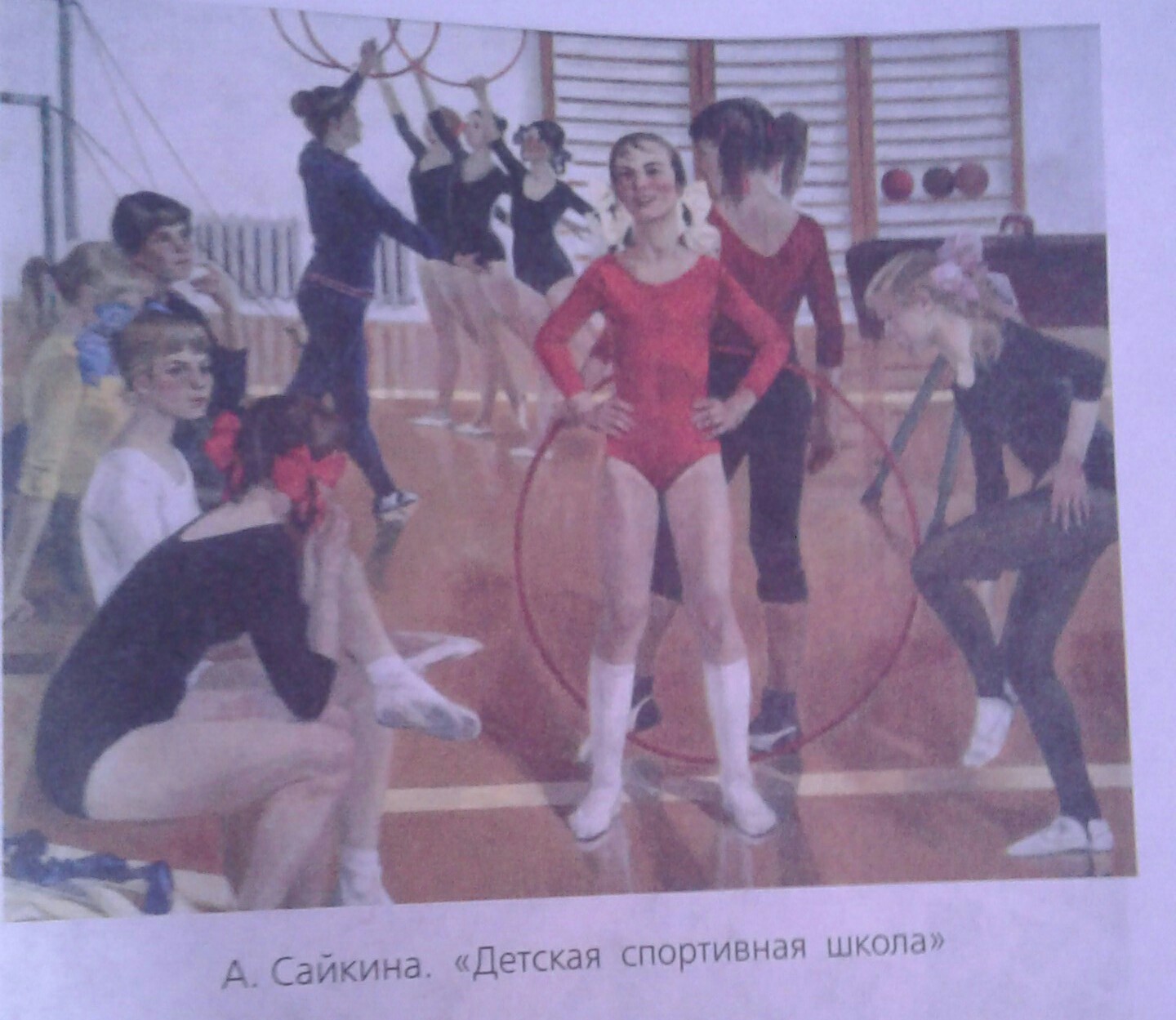 давайте рассмотрим картину Сайкина "детская спортивная школа "на главном плане которого изображена девушка в красном трико, видно, что она настроена на труд и грядущие победы. Ее статура полна сил и энергии, они готова идти вперед к вершинам спортивного Олимпа, где ей несомненно есть местечко. На заднем плане так же видно детей занятых любимым делом, они отдают свои силы и оттачивают свое мастерство, чтобы стать лучше. Картина наполнена смыслом, атмосферой и необычайно большим трудом.