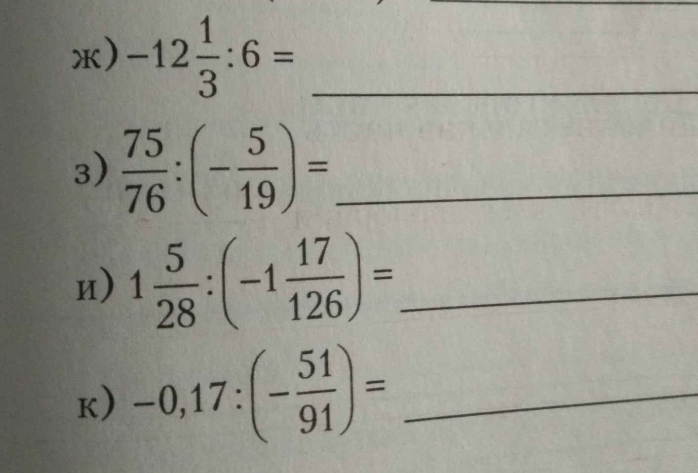 з) так же как в примере ж переворачиваем вторую дробь. 75/76*(-19/5). Сокрашаем 75 и 5 на 5. Вместо 75 остается 13, вместо 5, 1. Сокращаем так же 76 и 19 на 19. Вместо 76 остается 4,вместо 19, 1. Ответ: -13/4