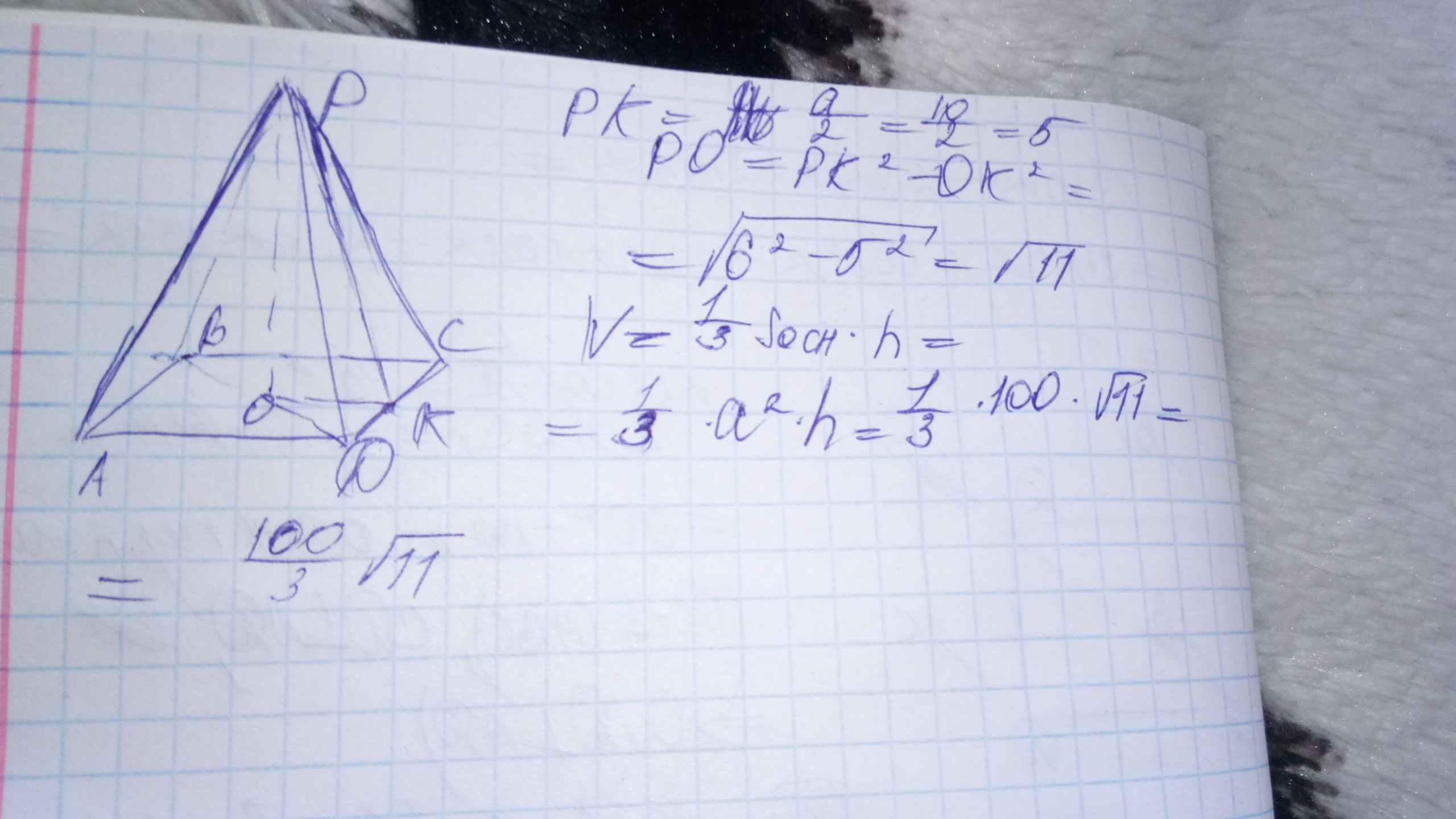 дано правильную 4кутную пирамиду сторона основт 10см , апофема 6 см. Знайти обєм пирамиди