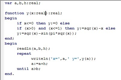 Написать программу вычисления функции y=f(x) . Заполнить таблицу значений x, y=f(x) при x∈[a, b] с шагом h.