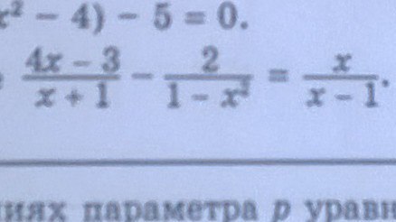 4x-3/x+1-2/1-x^2-x/x-1=0 4x-3/x+1-2/(1-x)*(1+x)-x/x-1 =0. 4x-3/x+1-2/-(x-1)*(1+x)-x/x-1=0. 4x-3/x+1+2/(x-1)*(1+x)-x/x-1=0. (x-1)*(4x-3)+2-x*(x+1)/(x-1)*(x+1)=0. 4x^2-3x-4x+3+2-x^2-x/(x-1)*(x+1)=0. 3x^2-8x+5/(x-1)*(x+1)=0. 3x^2-3x-5x+5/(x-1)*(x+1)=0. 3x*(x-1)-5*(x-1)/(x-1)*(x+1)=0. (x-1)*(3x-5)/(x-1)*(x+1)=0. 3x-5/x+1=0. 3x-5=0 3x=5. x= 5/3,x не равно -1;x не равно 1