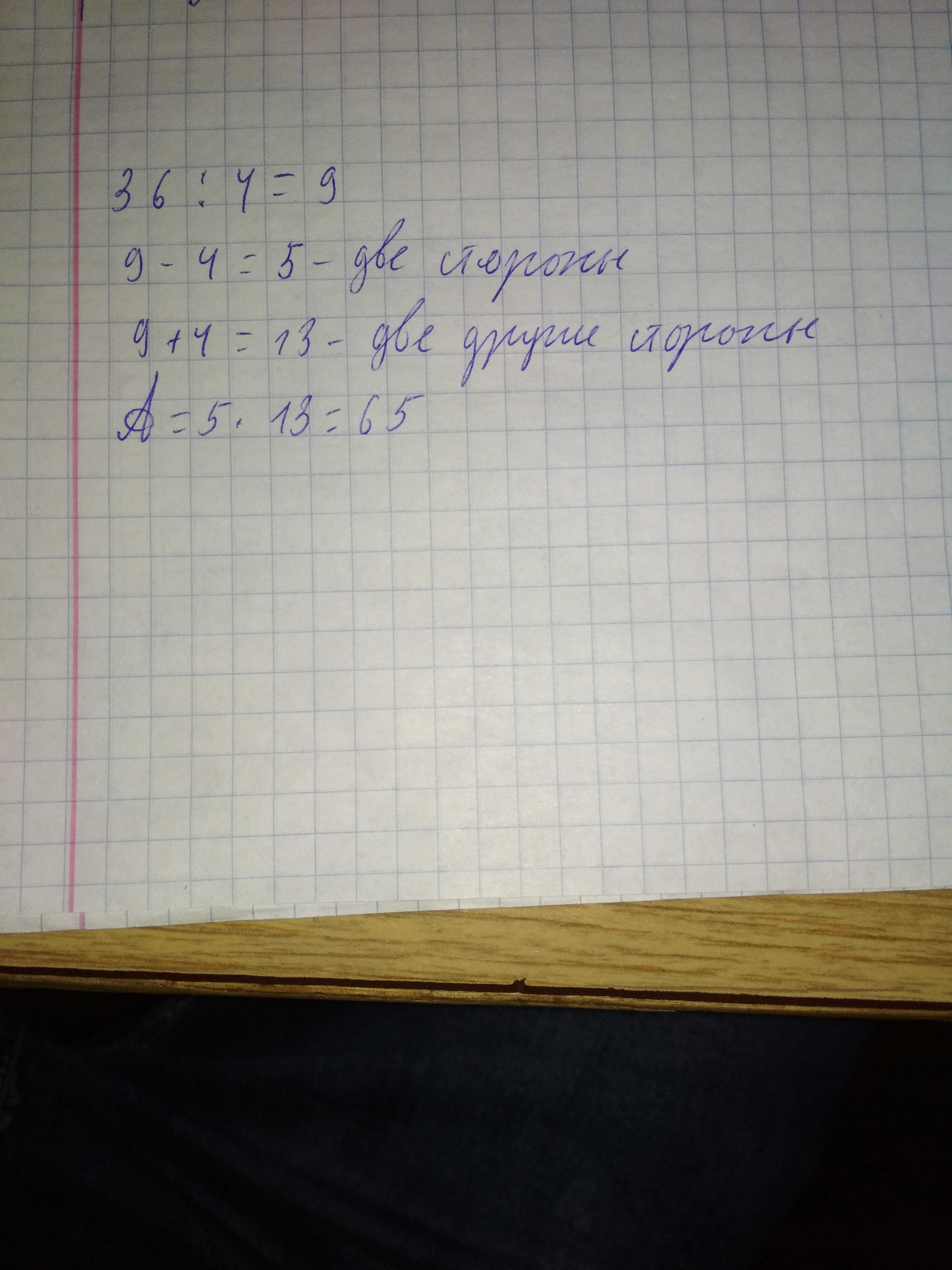 Периметр прямокутника = 36 см причому одна з йогосторін на 4 см менша за іншу. Знайдіть сторони прямокутника і його площу