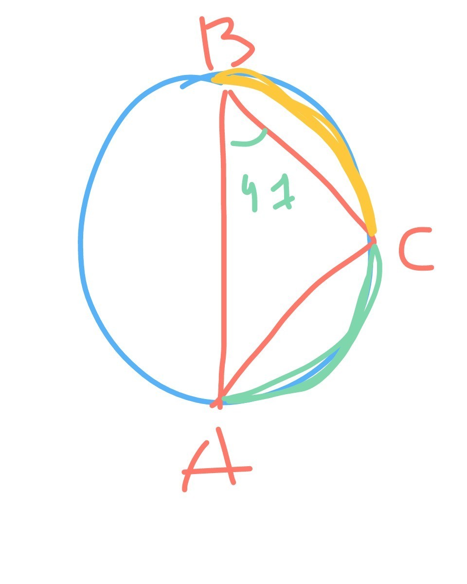 Окружность диагональю делится на дуги по 180°. Чтобы найти дугу ВС , надо из 180 вычесть дугу АС. Так как АВС вписанный угол, то дуга, относящаяся к нему = 47 • 2=94 . Тогда ВС =180-94=86°