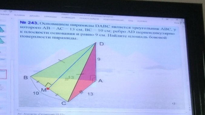 Для треугольника BCD : Найдем сторону CD из теоремы Пифагора, то есть CD^2 = 13^2 + 9^2 = 250. Значит высота MD = sqrt ( 250 - 10/2) = 15.