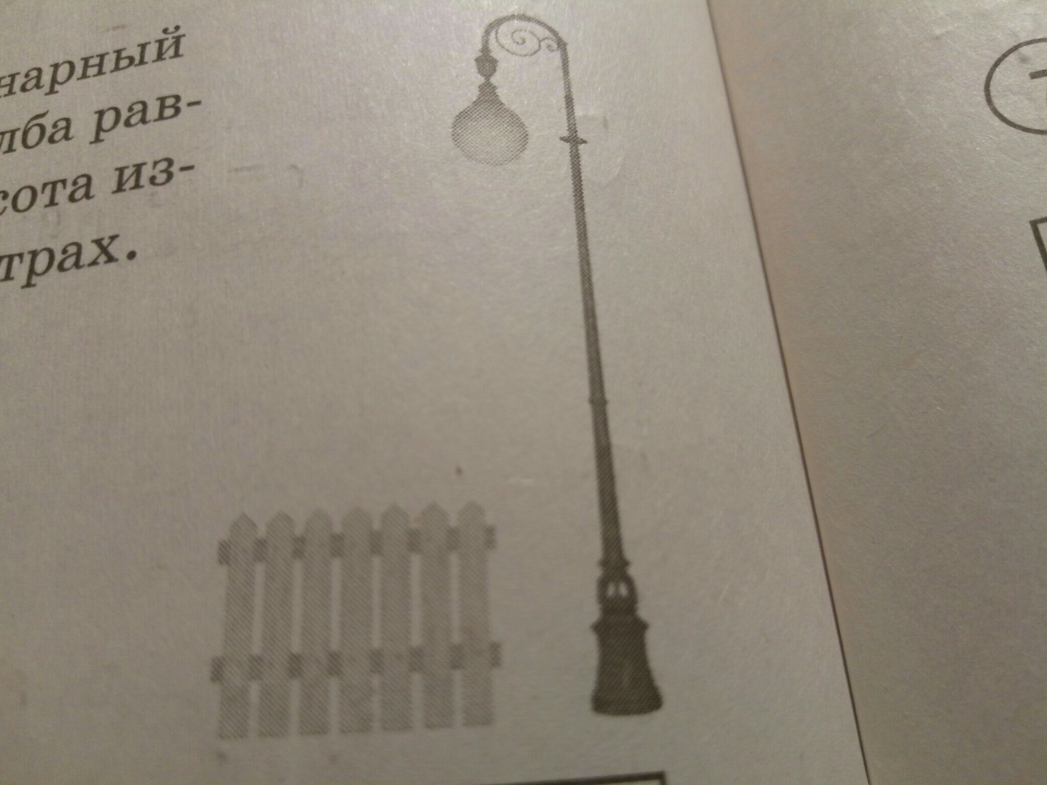 На рисунке изображены фонарный столб и изгородь. Высота столба равна 6м. Какова примерная высота изгороди? Ответ дайте в сантиметрах