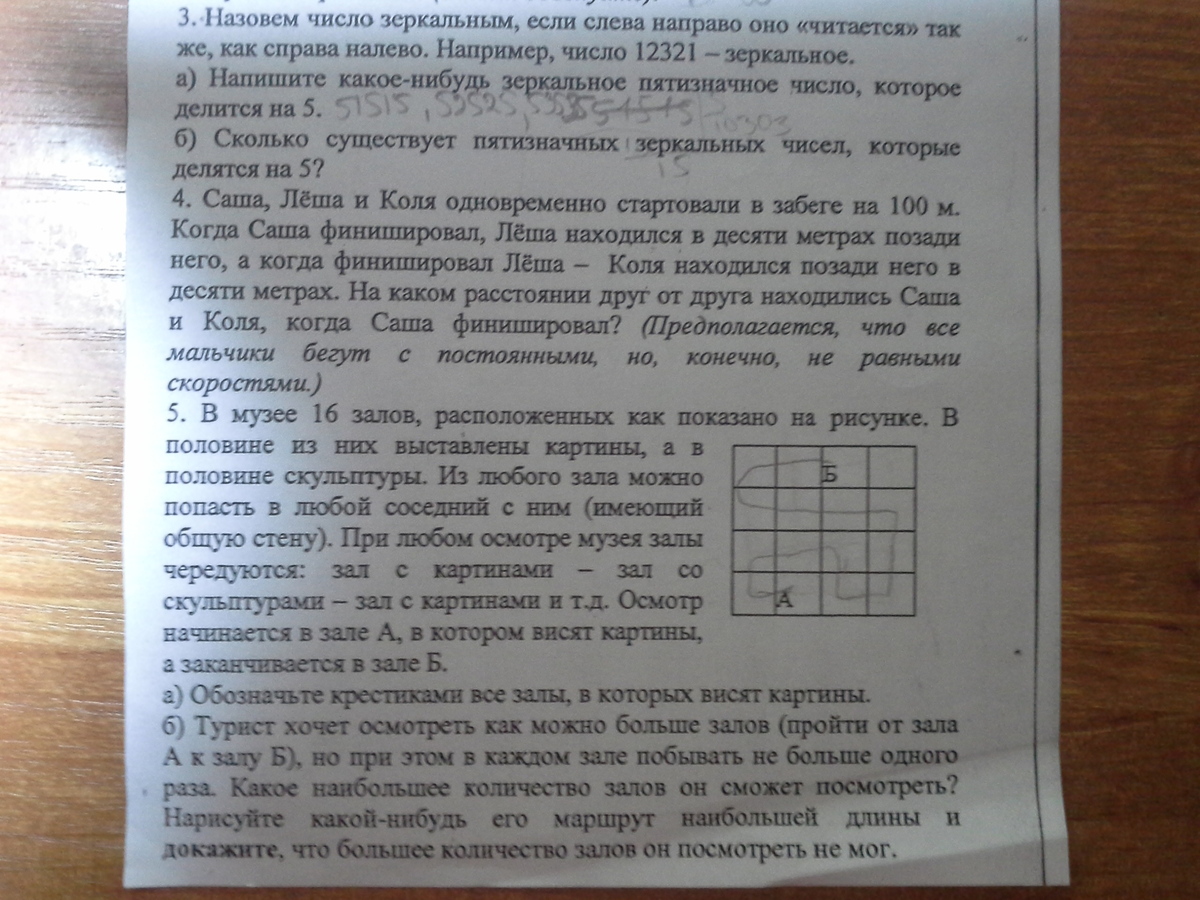 4) Саша, Лёша и Коля одновременно стартовали в забеге на 100 мертров. Когда Саша финиширова, Лёша был в десяти метрах позади него. А когда финишировал Лёша, Коля был позади него в десяти метрах . На каком расстоянии находились Саша и Коля когда Саша финишировал???(Предполагается , что мальчики бегут с постоянными, но, конечно не равными скоростями)