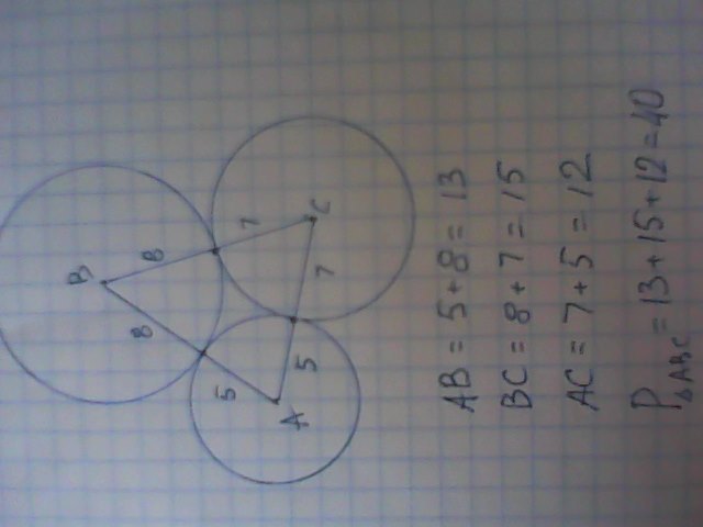 Три кола, що мають радіуси 5,8,7 см попарно дотикаються, обчислити P трикутника з вершинами центра цих кіл.