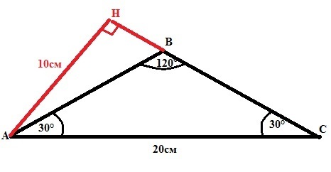 В равнобедренном треугольнике один из углов 120 градусов Найдите длину основания если длина высоты проведенной к боковой стороне, равна 10 см