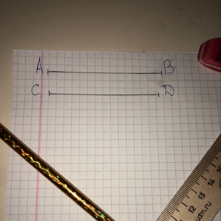 Начертите два отрезка AB=7 см 4 мм, а отрезок CD на 3 мм короче.