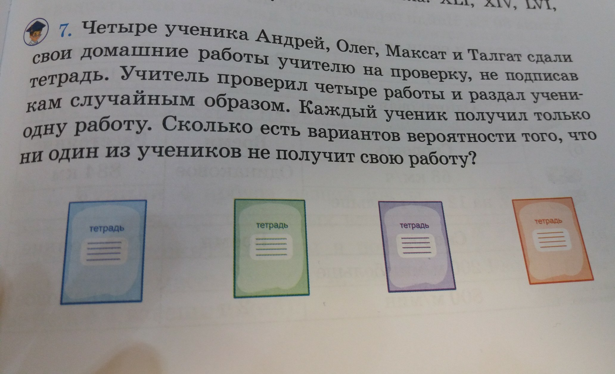 Так как учеников 4 и работ 4, вероятность 4