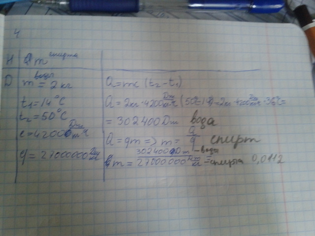 Помогите(картинка есть)Сколько спирта надо сжечь , чтобы воду массой 2 кг нагреть от 14 до 50 градусов? Я не могу понять решение.