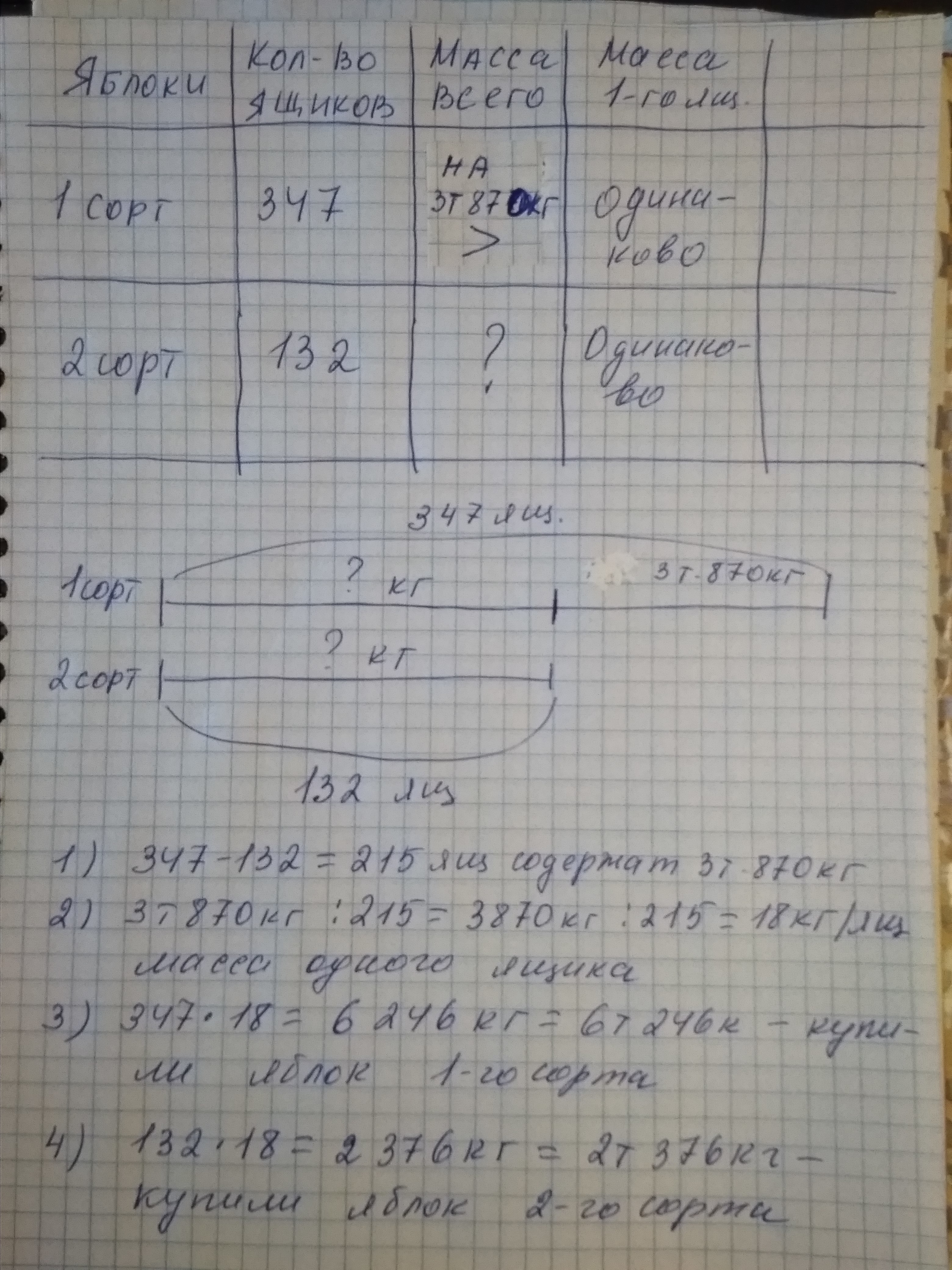 компания по производству соков выкупила 347 ящиков яблок первого сорта и 132 ящика яблок второго сорта яблок первого сорта было на 3 тонны 870 кг больше чем яблок второго сорта Сколько килограмм каждого сорта купила компания или в каждом ящике было одинаковое количество яблок