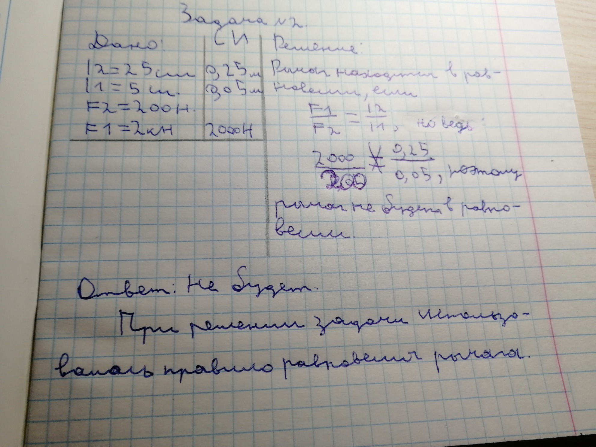 Длина одного плеча 25см другого 5см на большее плечо действует сила 200Н. На меньшее 2кН. Будет ли рычаг в равновесии. Почему? Опишите правило которое вы использовали
