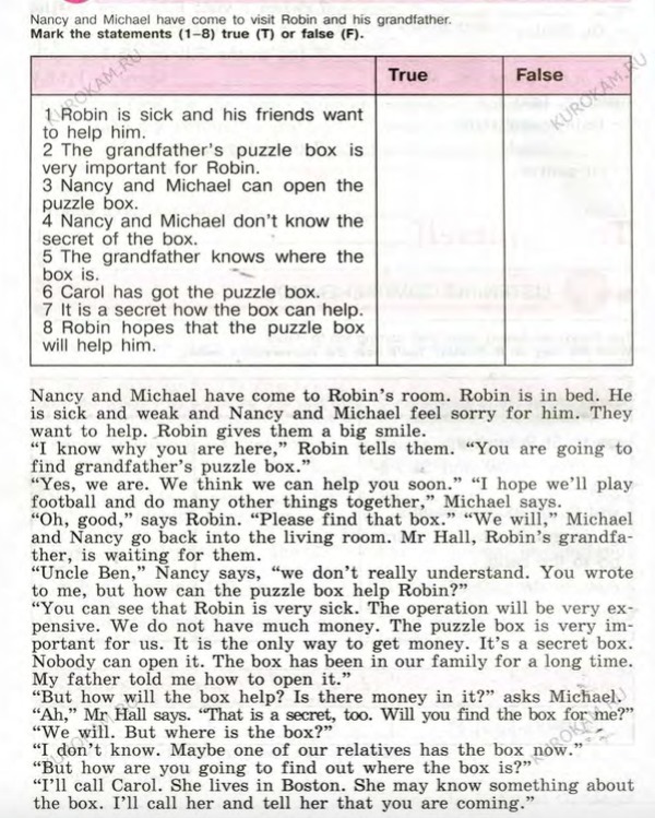 Нэнси и Майкл пришли в комнату Робин. Робин лежит в постели. Он болен и слабый, и Нэнси и Майкл жалеют его. Они хотят помочь. Робин дает им большую улыбку. «Я знаю, почему ты здесь, - рассказывает им Робин. «Ты собираешься найти пазл для дедушки». «Да, мы находимся. Мы думаем, что можем помочь вам в ближайшее время». «Надеюсь, мы будем играть в футбол и делать много всего вместе», - сказал Майкл Сас Робин. «Пожалуйста, найдите эту коробку». Мы с Майклом и Нэнси вернемся в комнату для переговоров. Мистер Холл, Гранд Робин, ждет их «Дядя Б», говорит Нэнси, «мы действительно не понимаем. Вы писали мне, но как может помочь головоломка Робин? »« Вы можете видеть, что Робин очень болен. Операция будет очень задумчивой. У нас мало денег. Коробка очень важна для нас. Это единственный способ получить деньги. Это секретная коробка. Никто не может его открыть. Коробка была в нашей семье в течение длительного времени. Мой отец сказал мне, как открыть его. - Но как поможет коробка? Есть ли в ней деньги? - спрашивает Майкл. - Ах, - говорит мистер Холл. Это тоже секрет. Вы найдете ящик для меня? «Мы будем, но где ящик?» Я не знаю. Возможно, у одного из наших родственников есть коробка. «Но как вы узнаете, где находится ящик?» «Я позвоню Кэрол, она живет в Бостоне, она может что-то знать о коробке, я позвоню ей и скажу, что ты придешь». ВТОРОЕ ЗАДАНИЕ Я НЕ ПОНЯЛА!! СОРРИ!!!