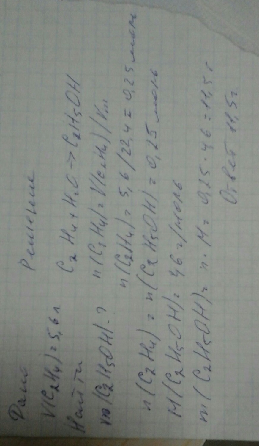 Вычисление массу этанола, образовашегося при взаимодействии 5,6 л этилена (н,у,) и воды