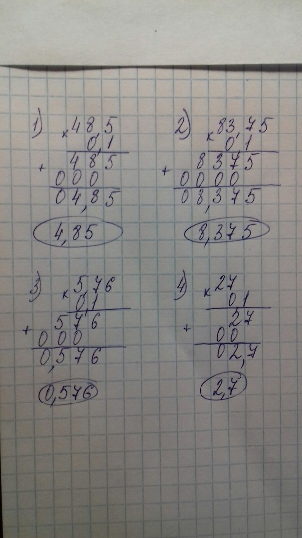 найдите значение произведения: 48,5*0,1 ; 83,75*0,1 ; 5,76*0,1 ; 27*01 столиком пожалуйста