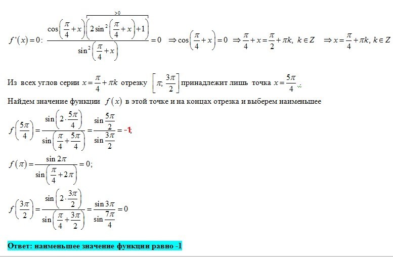 Найдите наименьшее значение функции f(x)=sin2x/sin(П/4+х) на промежутке [П;3П/2]