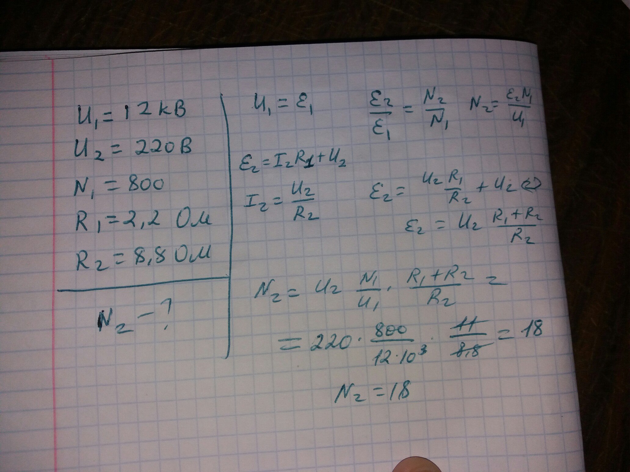Автотрансформатор понижает напряжение с 12кВ до 220В. В первичной обмотке трансформатора содержится 800 витков. Сопротивление вторичной обмотки составляет 2,2Ом, сопротивление внешней цепи равно 8,8Ом. Пренебрегая сопротивлением первичной обмотки, определите число витков во вторичной обмотке.