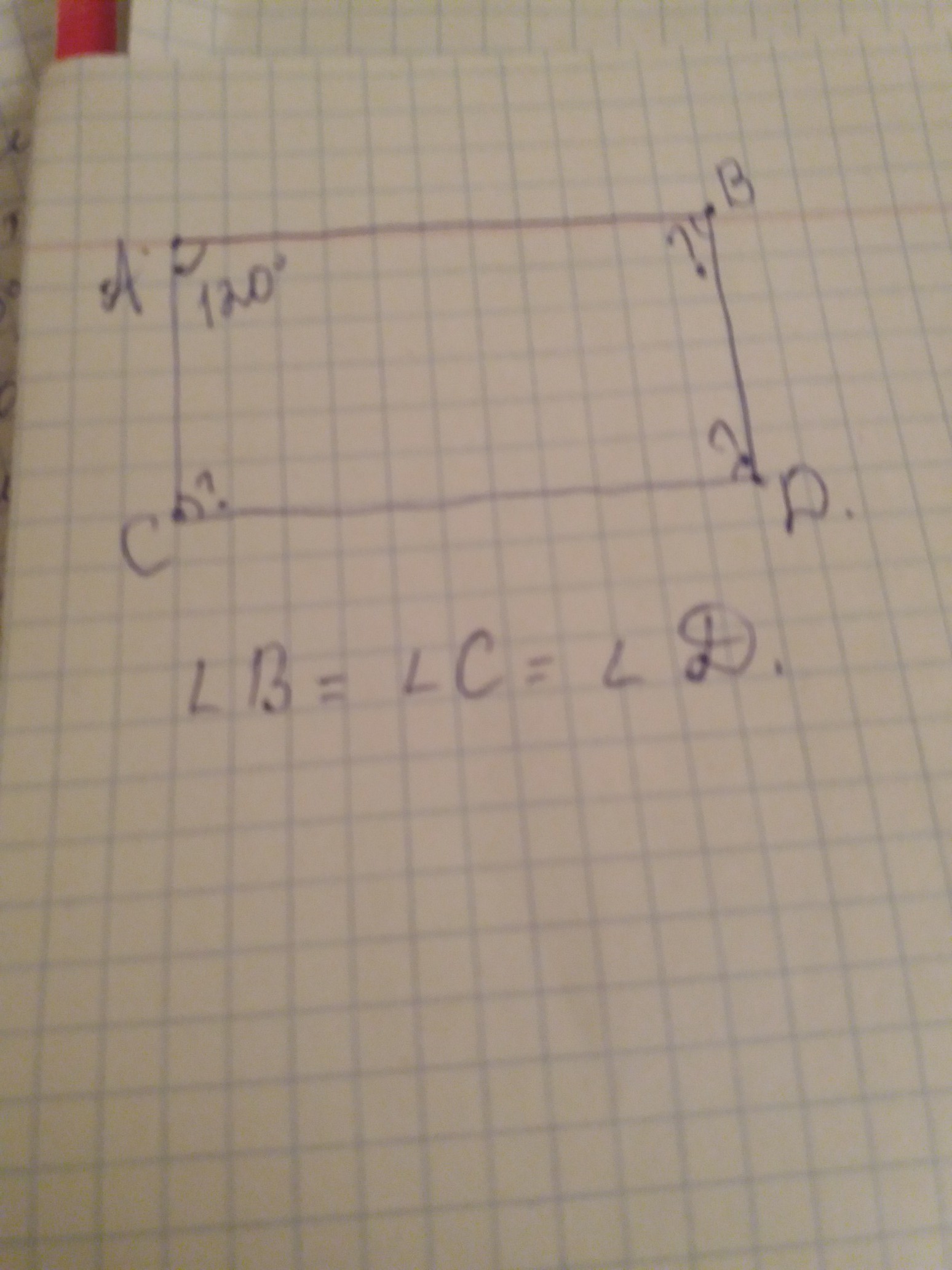 В прямоугольнике сумма всех углов равняется 360°, т.к. угол А=120°, то уголД+уголВ+уголС=240,