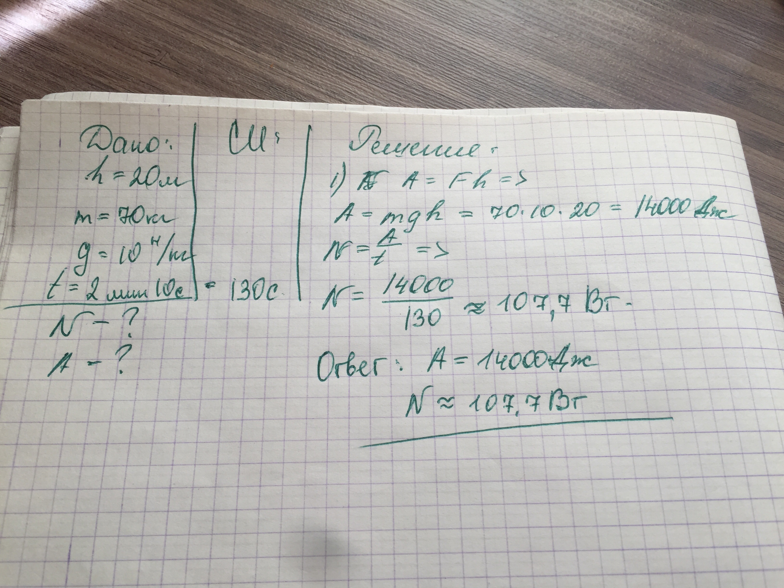 1.Рассчитать работу и мощность при подъеме по лестнице высотой 20 м, человека массой 70 кг.Время подъема 2 мин 10 с..