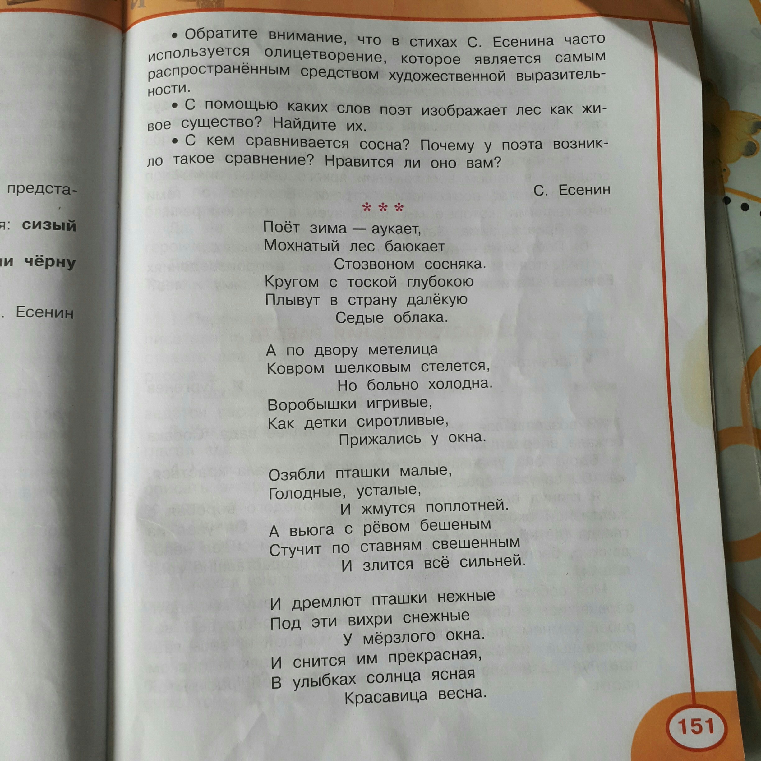 Есенин воспринимал природу цельно, как живой организм, поэтому часто использовал олицетворение.Примеры олицетворения: «зима аукает и баюкает», «метелица ковром шелковым стелется», а «вьюга злится все сильней».